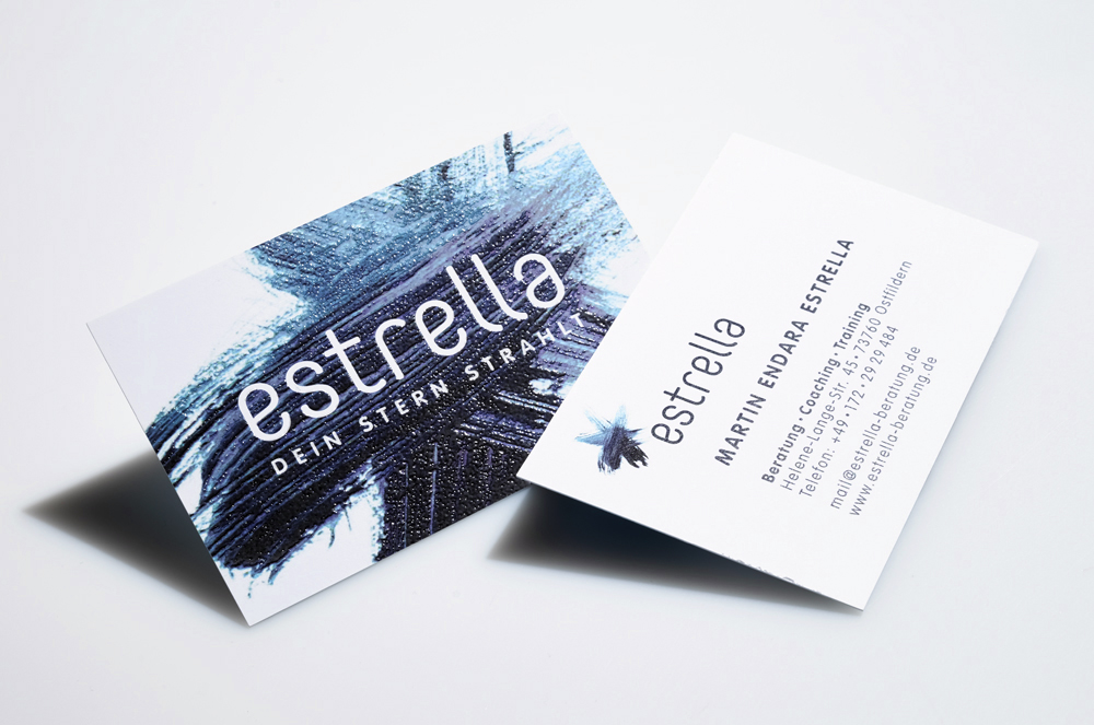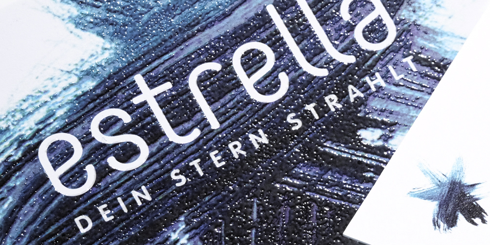 Also haben wir Computer und Vektoren durch Pinsel, Farbe und Papier ersetzt. Herausgekommen ist eine dynamische und individuelle Sternenform, die durch den Kontrast der Blautöne und den wechselnden Farbauftrag tatsächlich strahlt. Die mit Relief-Lack geprägten Pinselstrukturen auf den Visitenkarten verstärken zusätzlich noch diesen Eindruck – die haptischen Vertiefungen sind jetzt förmlich fühlbar.