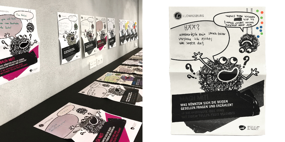 Auf unseren Layouts unterhalten sich zwei „Knäuel“ in Geheimsprache. Das Rätsel kann nur in der Ausstellung gelöst werden – also nix wie hin! Die frechen, plakativen und possierlichen Kerlchen konnten so zu einem großen Besucheransturm beitragen.