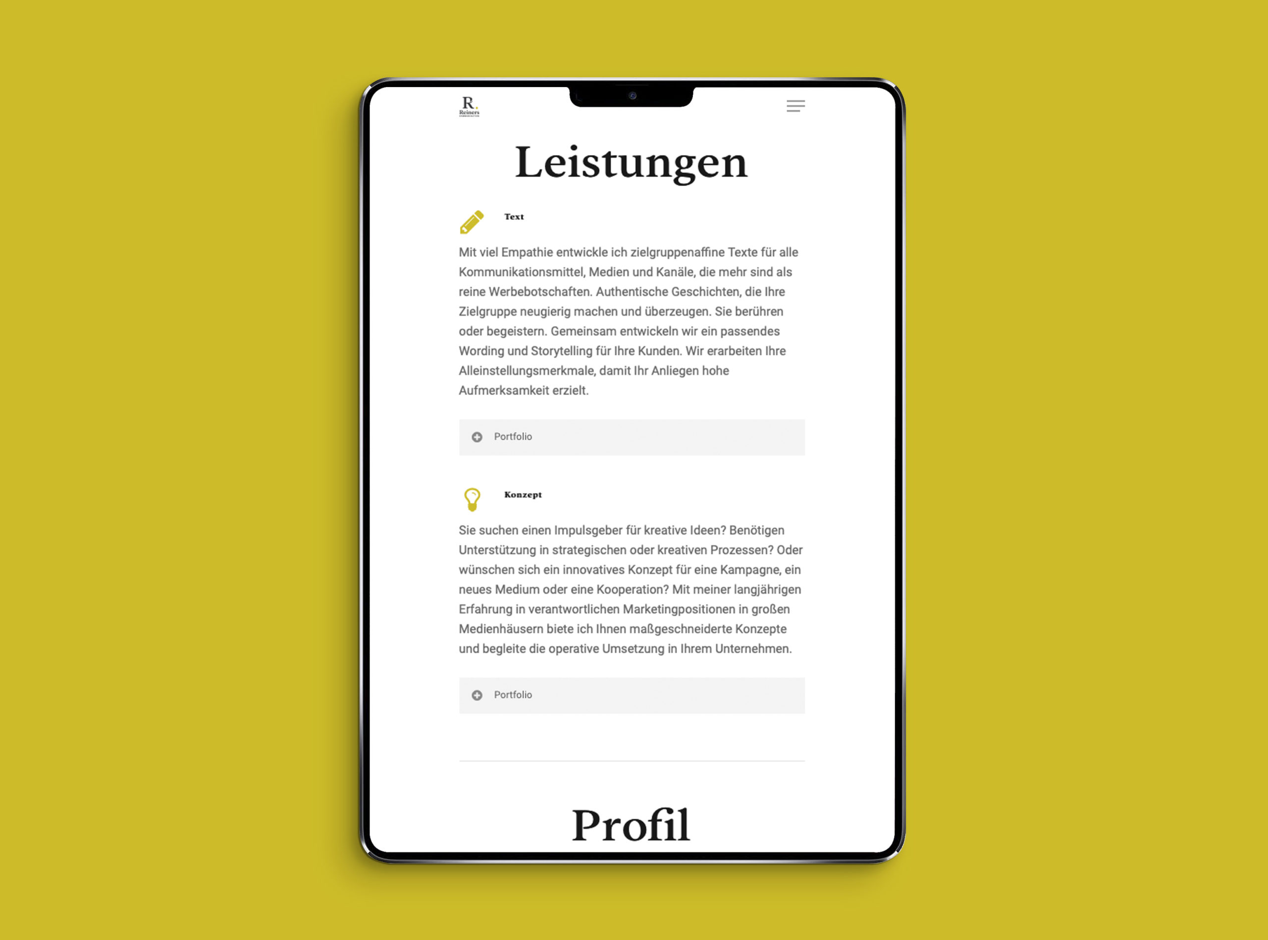 Tanja Reiners ist cool, fokussiert und charmant – und einfach gut. Um Sachen auf den Punkt zu bringen braucht es nicht viel Tamtam: starke Texte, richtig gute Fotos, eine freundliche Gestaltung. Perfekt für den ersten Eindruck.
