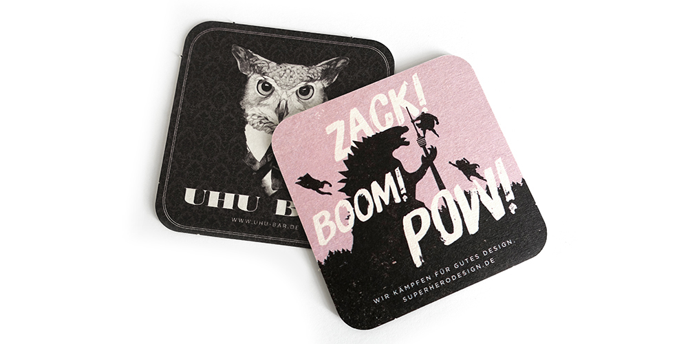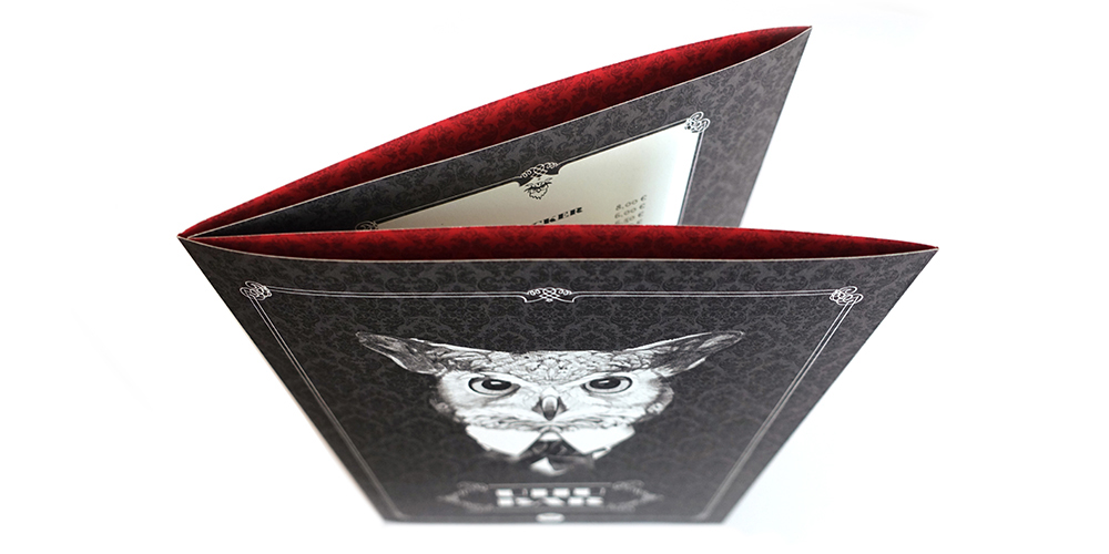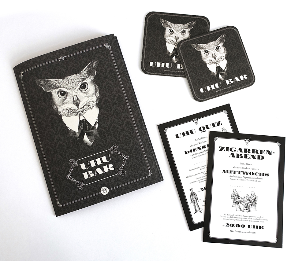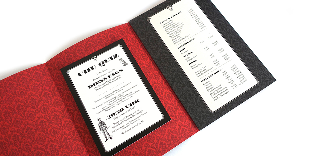 Die berühmte Uhu-Bar im Stutt­garter Rot­licht­viertel ist ein beson­derer Ort. Nicht jeder darf da rein. Die von uns gestaltete Geträn­ke­karte mit barocken Orna­menten auf rotem Hin­ter­grund zitiert das gemüt­liche Inte­rieur und inter­pre­tiert die span­nende Mischung aus Style, Stil und Rot­licht. Die Innen­seiten der Karten bieten übrigens Platz für die Info-Kärtchen zweier legen­därer Uhu-Kulta­bende, der Quiz-Nacht und des Zigar­ren­abends.